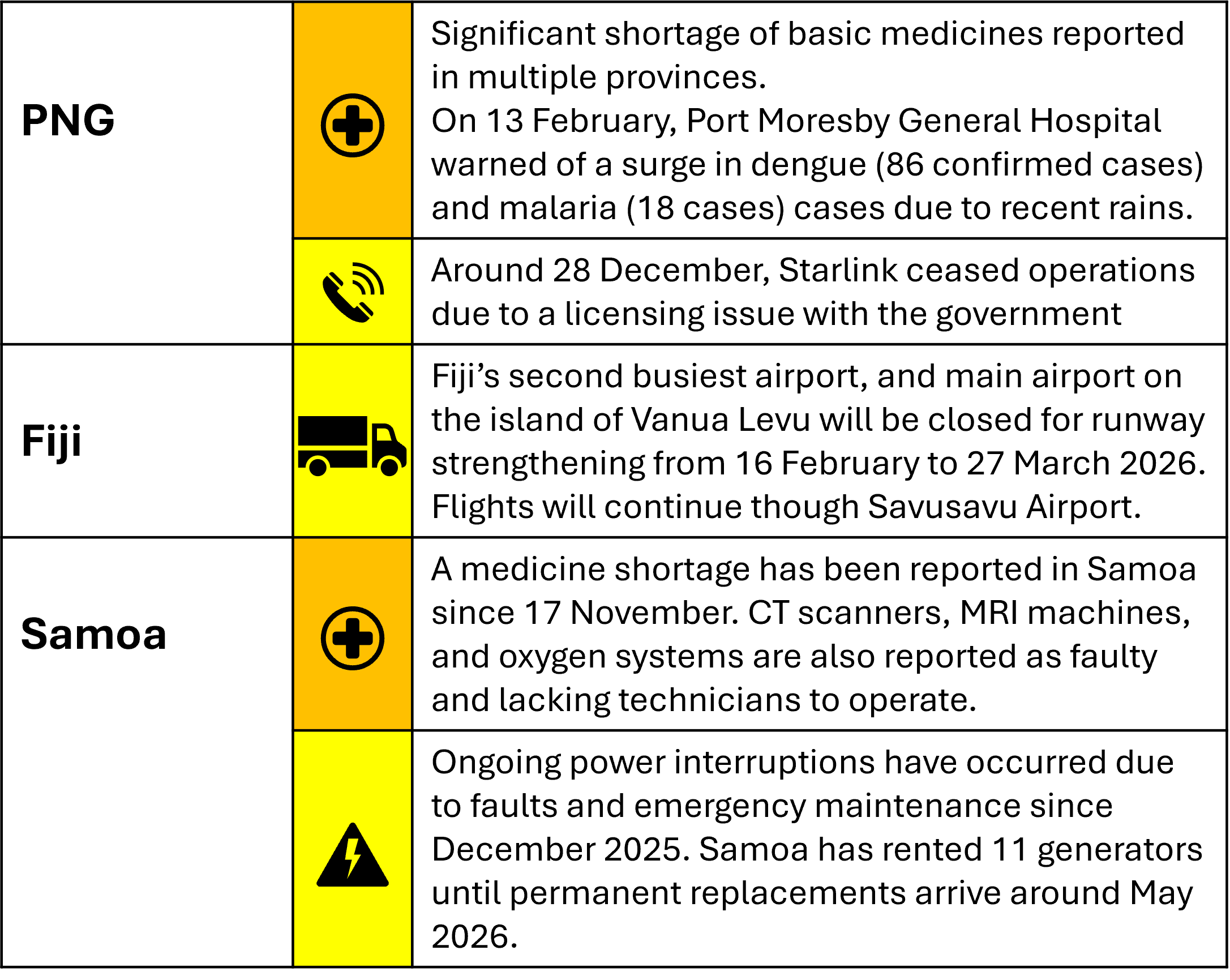 Headline summaries on stability, security, and foreign influence developments across the South Pacific.